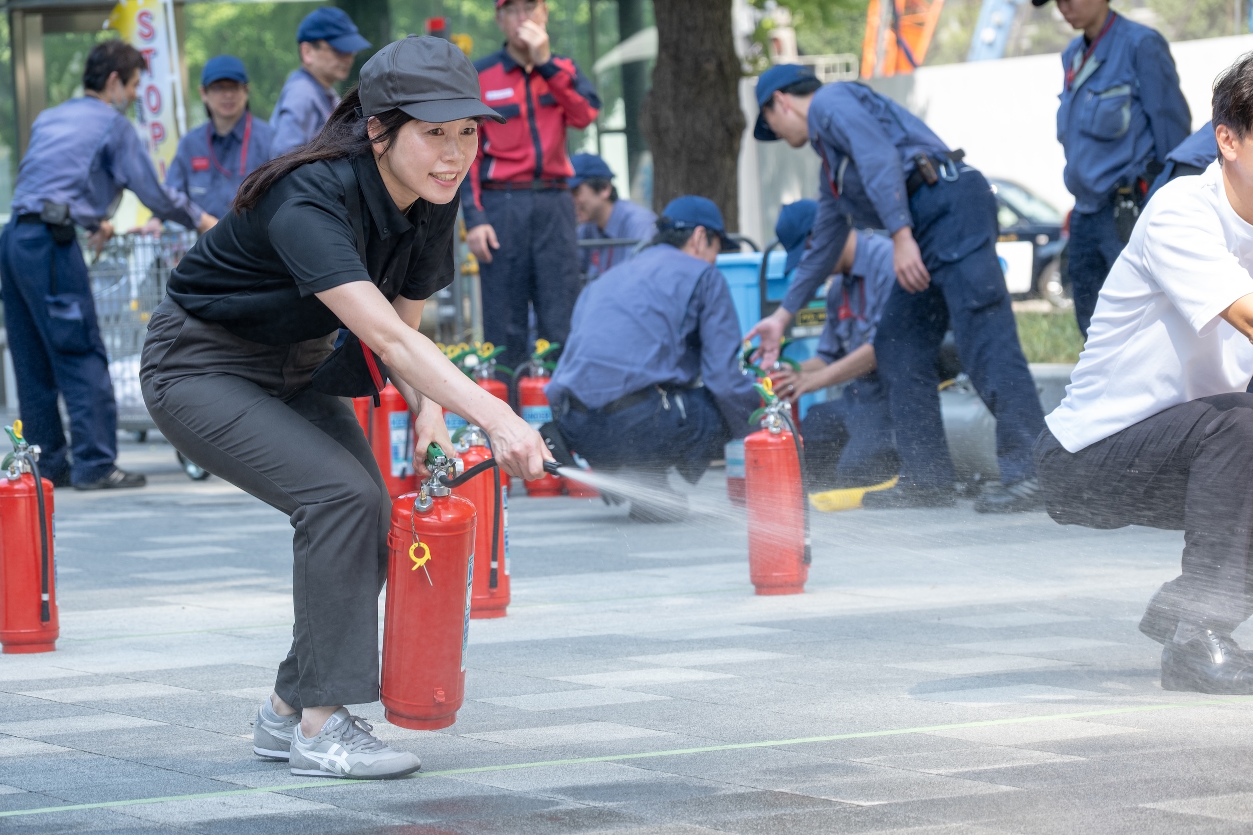 皇居を望む行幸通りでは、消火栓訓練、消化器訓練、VR防災車体験など一般来街者も参加できる体験型メニューを用意し、地域全体で防災意識を高める機会としました。この取り組みは、単なる避難訓練にとどまらず、「まち全体のレジリエンス強化」を目指しています。コンシェルジュもこの訓練に参加しました。